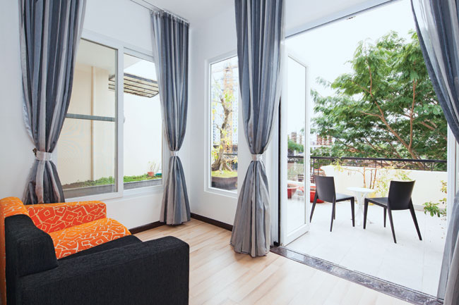 Từ phòng giải trí có thể tận hưởng khoảng sân và cây xanh bên ngoài.