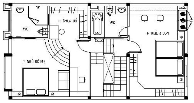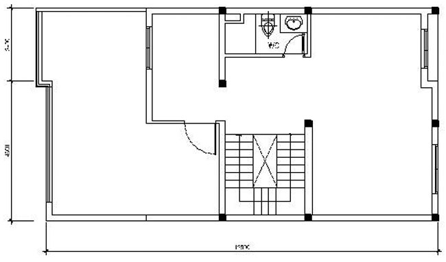 Tầng trệt được thay đổi bằng cách lùi vào để chừa thêm diện tích bên ngoài cho sân đậu xe hơi. Phòng vệ sinh ở ngay giữa nhà được đưa vào dưới chân cầu thang. Phòng khách được bố trí ngay ở tầng trệt nhìn thẳng ra khoảng sân có cây và hồ nước. Lầu 1 có chiều cao đến 3,6m cho cảm giác hơi bị lạc lõng khi sử dụng làm phòng ngủ. Người thiết kế đã xử lý độ cao bằng cách chia không gian làm hai cấp độ. Phía trên cao dành cho nơi làm việc, phòng vệ sinh. Phía thấp dành cho giường ngủ, việc phân chia này đem lại nét khác biệt cho phòng ngủ tạo nên sự thú vị với cảm giác thay đổi. Lầu 2, cầu thang được xoay vế để tăng diện tích cho phòng giải trí.