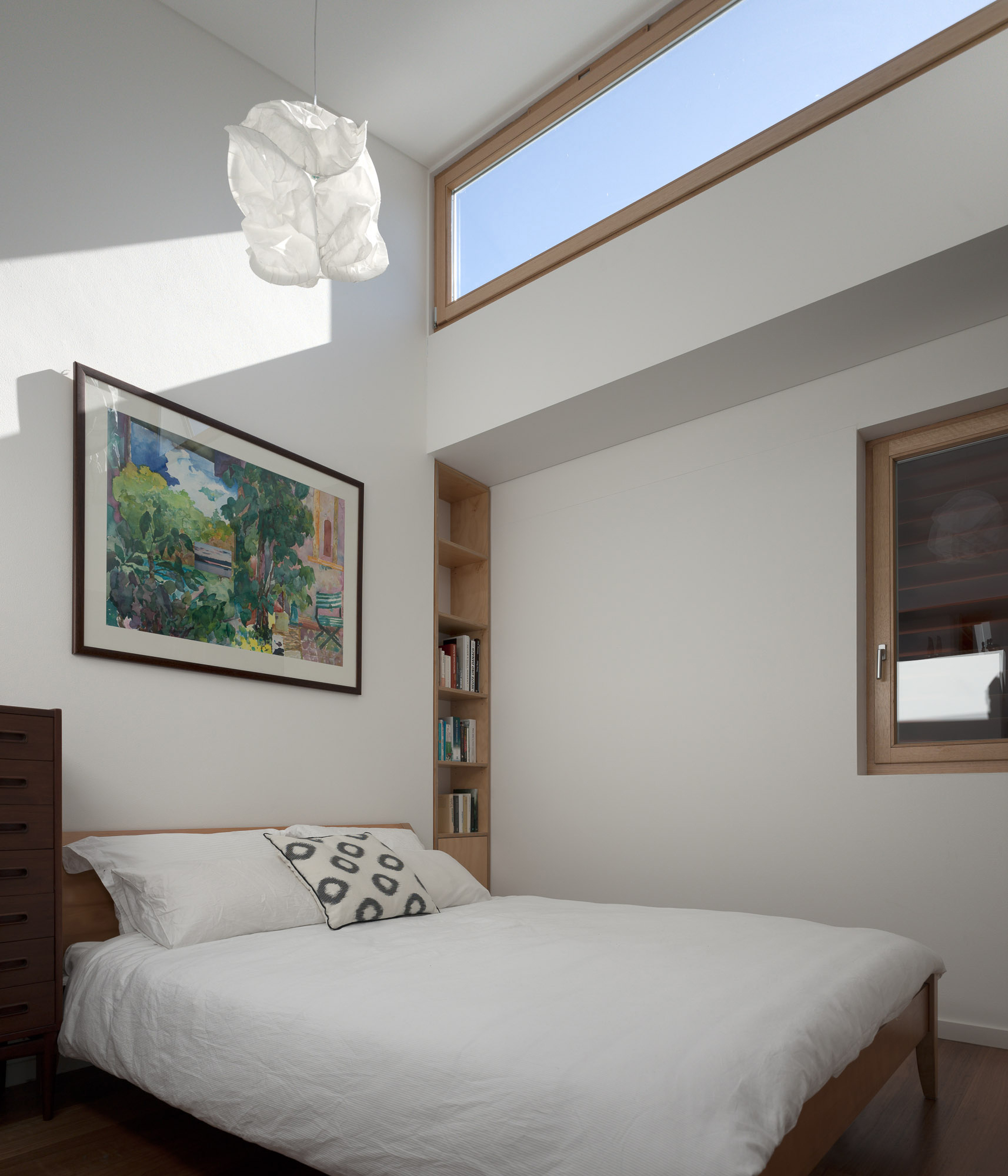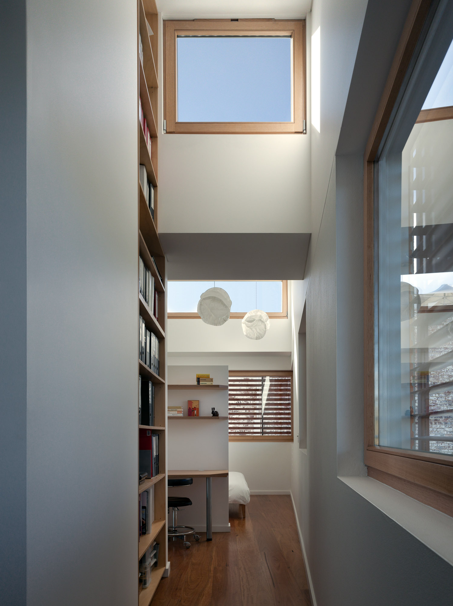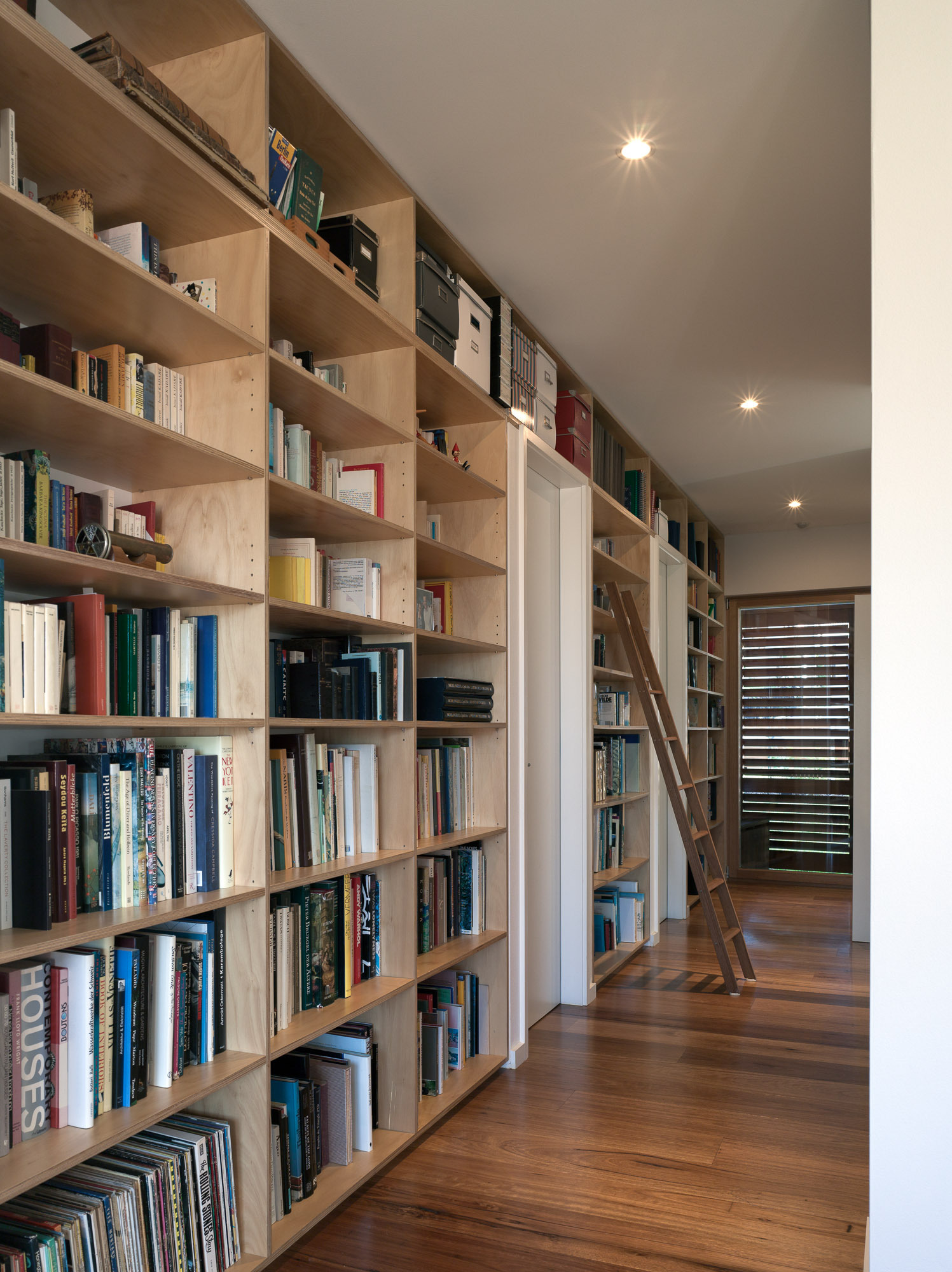Bên trong ngôi nhà được sắp xếp theo kiểu không gian rộng mở, giúp cho mọi hoạt động trong nhà vẫn có thể kết nối với bên ngoài. Tầng trệt chia ra gồm phòng ngủ kiểu dáng đơn giản với các khu vực nhà kho ngăn theo chiều dọc. Một thư viện tại nhà tuyệt vời là nơi ấp ủ những dự định mới. Đồng thời đây cũng được xem là góc thư giãn hay phòng nghiên cứu tại nhà, thật sự là một thiên đường (các kiến thức) dành cho người yêu sách. Trên hết, với cấu trúc mới của ngôi nhà, dấu ấn mà nó để lại cho bất cứ ai nhìn thấy quả là không thể phai nhạt. “Dự án này kết hợp các hệ thống tiên tiến mang lại hiệu quả cao, bao gồm một bể nước mưa riêng biệt dưới boong, trong mái nhà là tấm pin mặt trời dạng ống sơ tán cung cấp nước nóng và thủy lực sưởi ấm. Tất cả đều nằm bên phía trên của khu vực nghiên cứu tại nhà.” (Ảnh: Richard Glover).