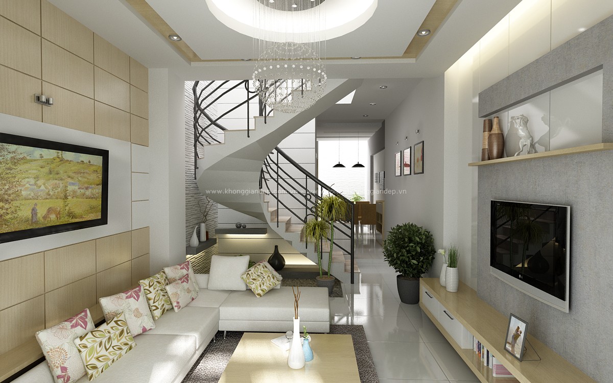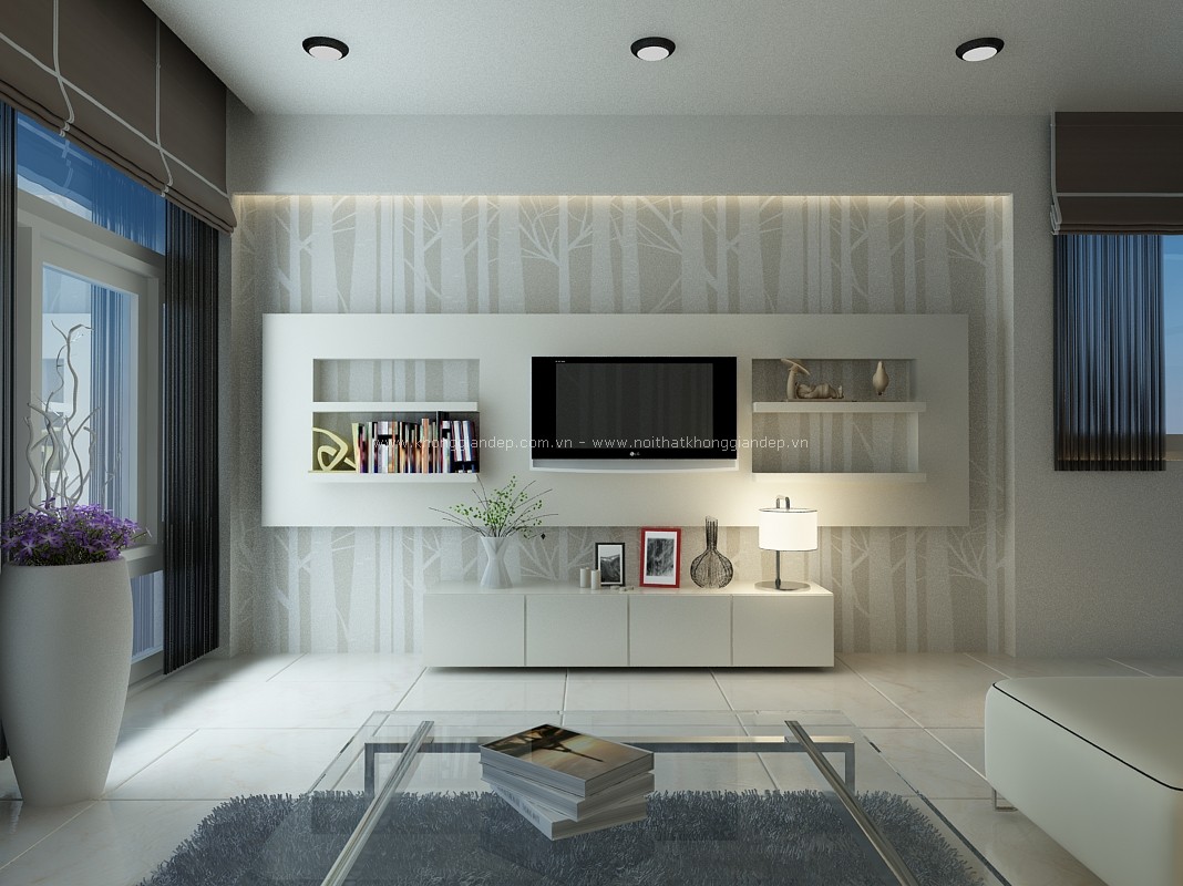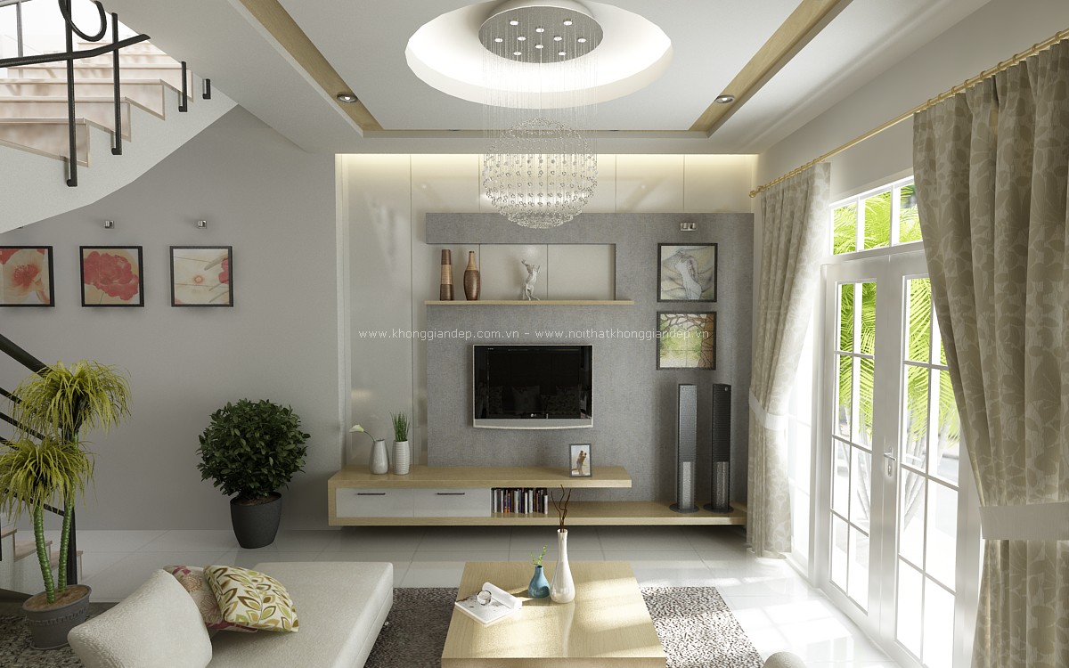 Bên cạnh đó, việc sử dụng những chiếc tủ đựng ti vi, bộ ghế sofa màu trắng nhẹ nhàng, hay màu kem nền nã, màu be nhã nhặn cũng giúp cho căn phòng khách sáng bừng và tươi mới.