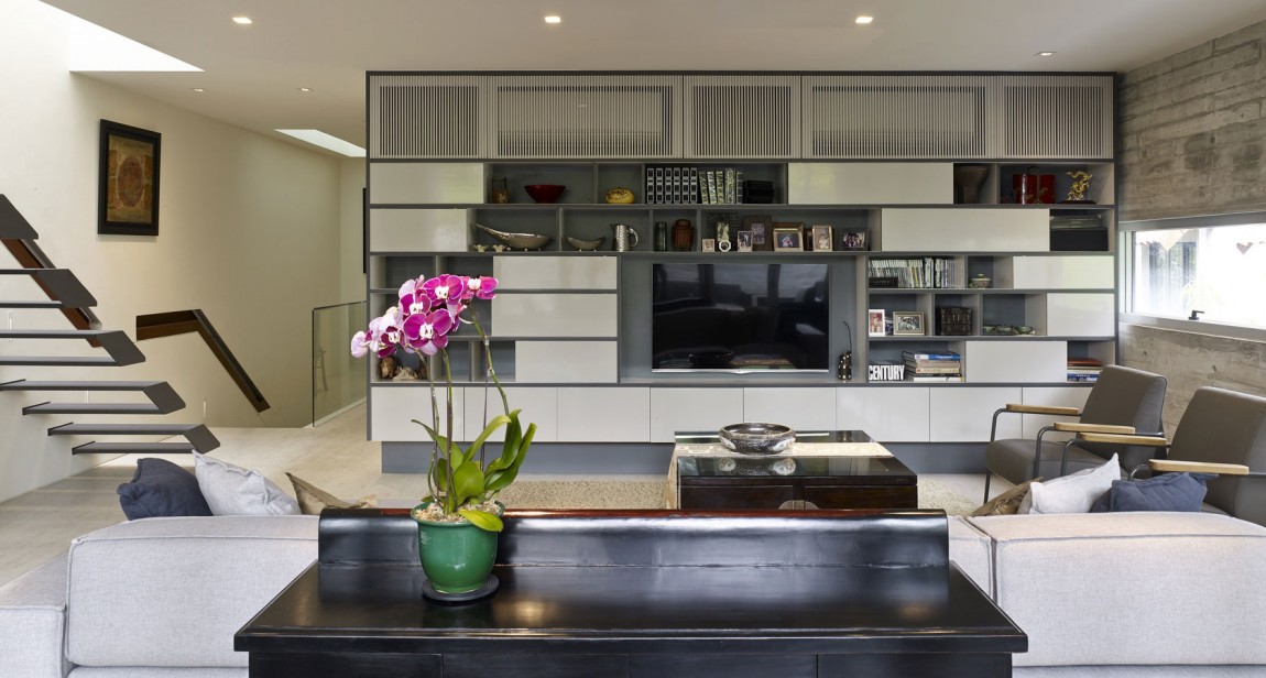 Hướng nhìn ra đường phố từ phía trước nhà ít “rõ ràng” hơn nhìn từ phía sau, trong khi cửa sổ được gắn bằng loại cửa chớp giúp ngăn cách không gian riêng tư của gia chủ. Tầng trệt của ngôi nhà là nhà bếp, phòng ăn, phòng nghiên cứu và một phòng sinh hoạt chung. Một phòng khách rộng rãi và các phòng riêng của trẻ em nằm ở tầng hai. Phòng ngủ nằm ở tầng trên cùng và kèm theo một sân thượng riêng với tầm nhìn bao quát toàn cảnh sườn đồi và các khu vực xung quanh.