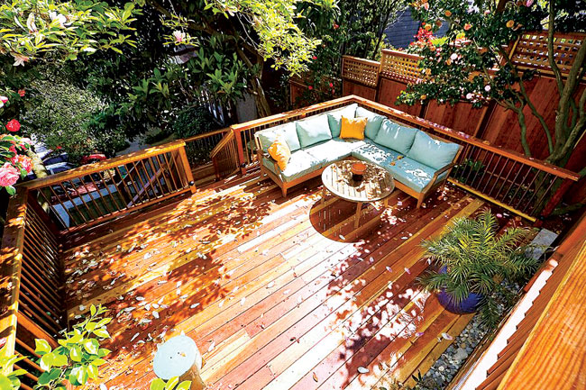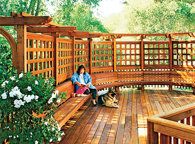 Từ lan can vòng cung, cái hoạ tiết uốn lượn đến sàn bo góc mềm mại, tất cả đều có thể uyển chuyển để hoà mình vào thiên nhiên, và trên hết là góp phần làm tăng nét độc đáo bắt mắt cho khu vực sinh hoạt ngoài trời của bạn. Bên cạnh đó bạn cũng cần phải chú trọng việc liên kết các mối nối và lựa chọn vật liệu phù hợp cho các khu vực chịu uốn cong. Gỗ tuyết tùng tây còn non là một sự lựa chọn tốt bởi tính mềm dẻo, màu sắc ấm áp, và khả năng chịu đựng thời tiết ngoài trời khá cao.