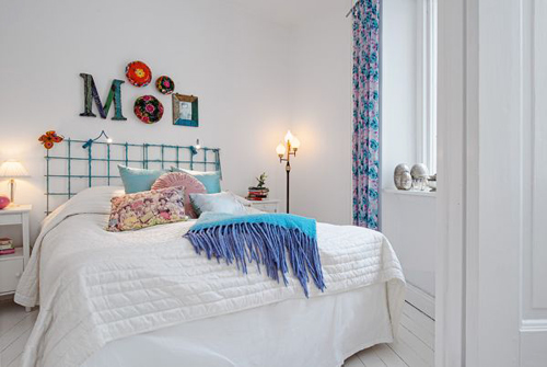 Phòng ngủ giữ nguyên gam màu trắng làm chủ đạo nhưng tươi sáng với màu xanh của rèm cửa, chăn mỏng, gối, phụ kiện trang trí treo đầu giường.