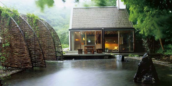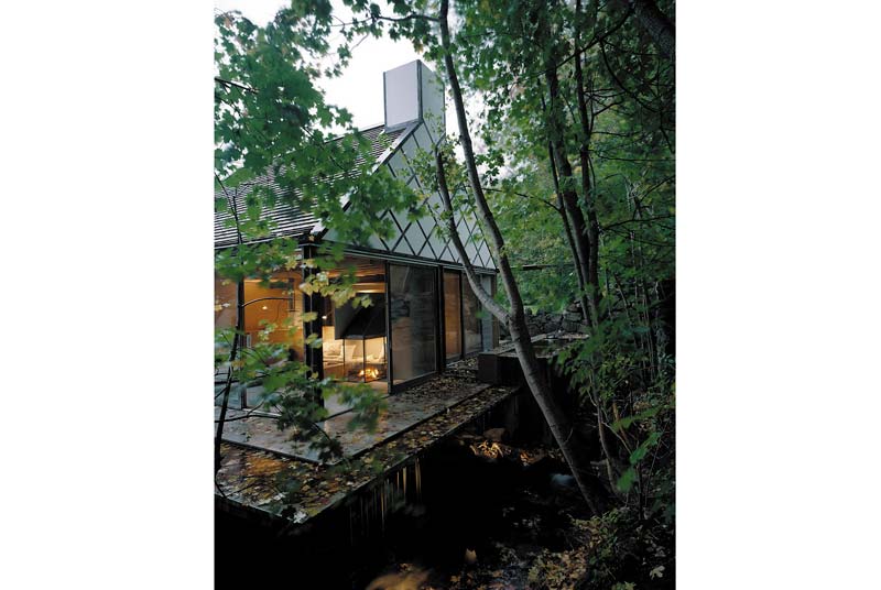 Trước cửa nhà có một mặt nước. Các cửa kính trong nhà đều có thể mở to hết cỡ để tiếp xúc với thiên nhiên càng nhiều càng tốt (vào mùa ấm), gia chủ có cảm giác đang cuộn mình giữa ổ thiên nhiên.