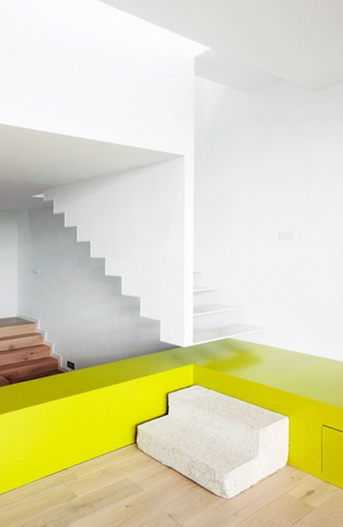 Phần trung tâm của tầng trệt được đặt thêm một tầng lửng cho phép chủ nhà có thể quan sát được phòng khách từ phía tầng hầm.