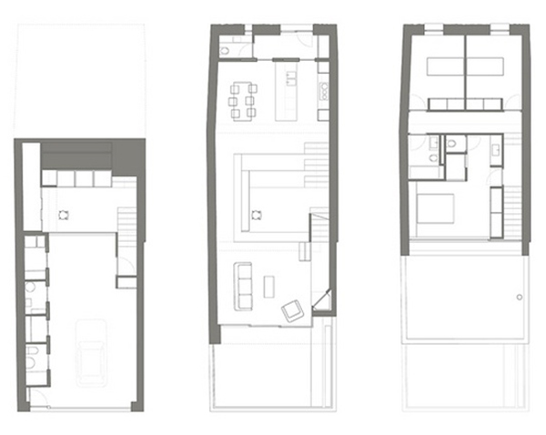 Tầng hầm được chăm chút để thích ứng với những khiếm khuyết cần thiết. Tầng này bao gồm lối vào chính của ngôi nhà, vì vậy kiến trúc sư có ý định tạo ra không gian mở rộng thay vì đặc tính tối tăm của tầng hầm để xe thường thấy.