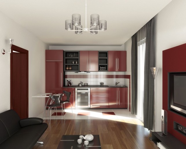 Nội thất đỏ sang và lạ cho phòng khách kết hợp nhà bếp