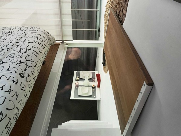 Giường có thể gập lại thành một chiếc ghế sofa êm ái, khi đó phòng ngủ trở thành một phòng khách thực sự. Chiếc một tivi gắn cố định trên tường sẽ là trợ thủ đắc lực giúp bạn giải trí và thư giãn. Những thanh rầm gỗ có màu đồng điệu với sàn nhà và một phần của tường, tạo sự tương phản với những đồ đạc hiện đại.