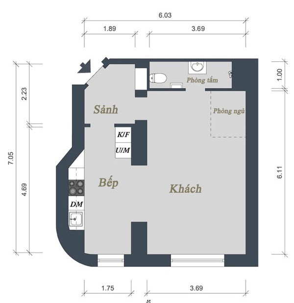 Với diện tích 44m², nếu chia nhỏ căn hộ thành các phòng thì riêng tường ngăn cũng đã chiếm khá nhiều diện tích, làm giảm thiểu không gian sử dụng. Do đó chủ nhân của căn hộ quyết định thiết kế nhà theo lối không gian mở, không sử dụng tường để tạo cho căn nhà cảm giác thoáng đãng và rộng rãi hơn.