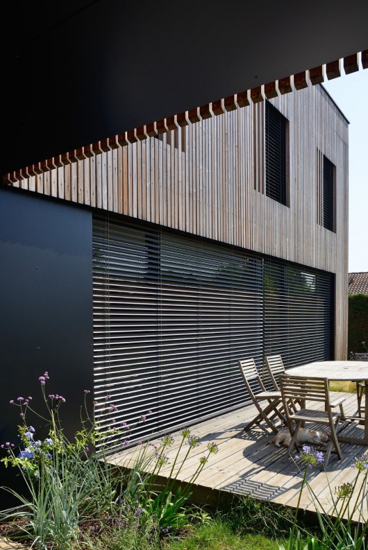 Phòng ngủ ở tầng trên có cửa sổ hơi nghiêng. Trên mặt tiền, phần sơn phủ tường bằng gỗ thông đục lỗ được gia cố để làm tăng gấp đôi 5 x 5 cm tường hòng nâng cao hiệu quả thông gió. Lớp sơn phủ có màu xám bạc nhẹ nhàng và tự nhiên. Bên trong, lớp lót tường được để nguyên thủy, tấm cảm biến ánh sáng màu nhạt được sử dụng thống nhất với tủ, đồ nội thất và các vật dụng lưu trữ khác. Ở những nơi khác, màu trắng của thạch cao làm tăng thêm sự mềm mại và khiến cho ngôi nhà trở nên sáng sủa, rộng rãi hơn.