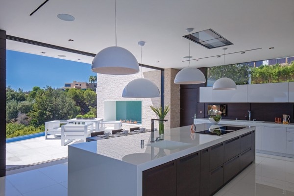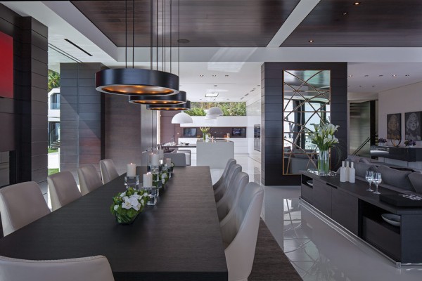 Phòng khách, phòng ăn và bếp được xây dựng hợp lý nhằm tận dụng lợi thế về tầm nhìn tuyệt vời ra khung cảnh bên ngoài. Ngoài ra, nội thất bên trong gồm tủ sơn mài tuyệt vời từ Ý và các thiết bị ứng dụng đầy nghệ thuật cũng giúp tăng thêm sự sang trọng cho ngôi nhà.