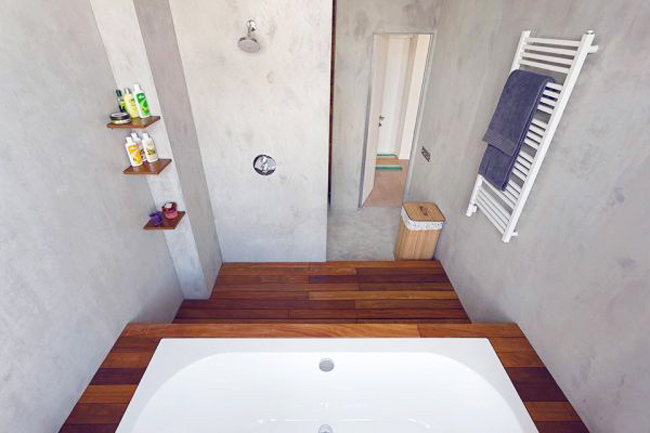 Khu vực bồn tắm bên trong cũng được thiết kế độ cao tầng khác nhau – một cách phân định ranh giới đơn giản mà hiệu quả. Sàn nhà ốp gỗ đảm bảo sự sạch sẽ cho không gian sử dụng nhiều nước như phòng tắm.