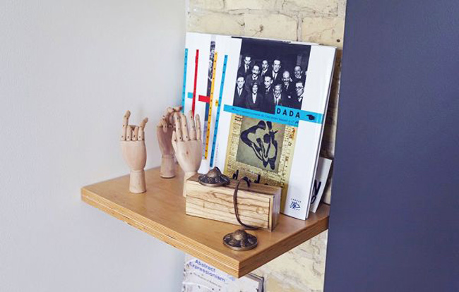 Kệ mở rất nhỏ được gắn sát tường là nơi để sách báo, đồ lưu niệm.