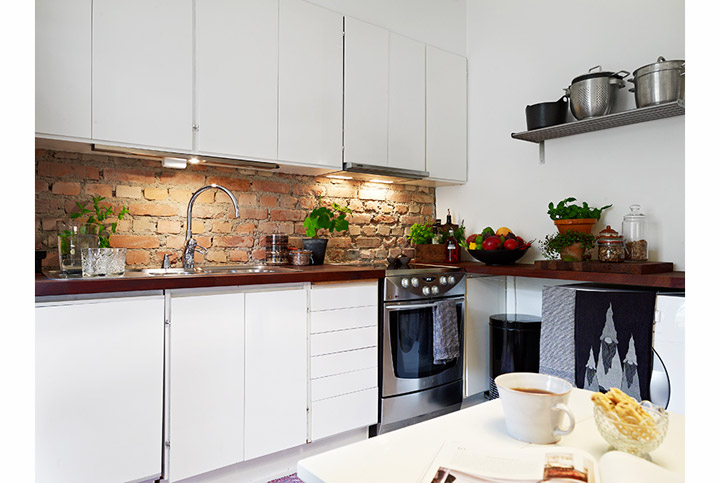 Trong bếp, bức tường với mảng gạch trần cho cảm giác ấm áp, “có hơi người”…