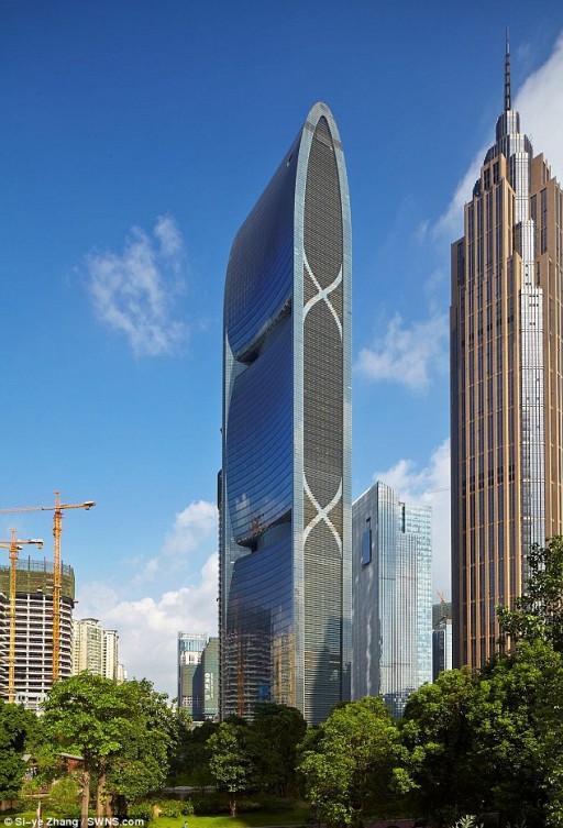 Ảnh phải: Cùng đứng ở vị trí thứ 9 là tòa nhà Trịnh Châu Greenland Plaza ở thành phố Trịnh Châu, Hà Nam, Trung quốc. Công trình bao gồm khu văn phòng và một khách sạn. Tòa nhà được đánh giá cao ở tính ứng dụng khi mặt tiền có khả năng chắn ánh nắng mặt trời chiếu trực tiếp vào bên trong và phản chiếu lại bằng ánh sáng dịu nhẹ hơn.