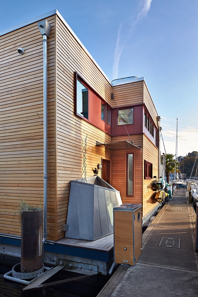 Cuộc sống trên mặt nước không phải là điều gì đó lập dị hay khác thường như một số người vẫn nghĩ. Với cấu trúc giống như một chiếc hộp, các tấm ván gỗ và vật liệu kim loại khác, ngôi nhà được trang bị nội thất gọn gàng với nhiều đồ trang trí trẻ trung và tạo cảm giác vui tươi. Khu vực bên trong được thiết kế mang lại dấu ấn thông qua màu sắc và đồ nội thất, bởi vì phòng khách không có cửa hay vách ngăn nào nhằm giúp sự di chuyển từ phòng này sang phòng khác được dễ dàng.