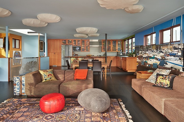 Sàn nhà được xây mở và thoáng mát cho phép nhìn ra quang cảnh độc đáo và xinh đẹp xung quanh. Đồ nội thất vô cùng sống động và vui tươi, phản ánh niềm đam mê của chủ nhà đối với nghệ thuật và văn hóa. Không gian sống động ở bến cảng là một trải nghiệm hấp dẫn, tuy nhiên không phải ai cũng cảm thấy thoải mái với điều đó. Dù vậy, những người sinh sống trên mặt nước sẽ tìm thấy sự thú vị ở ngôi nhà nổi này.