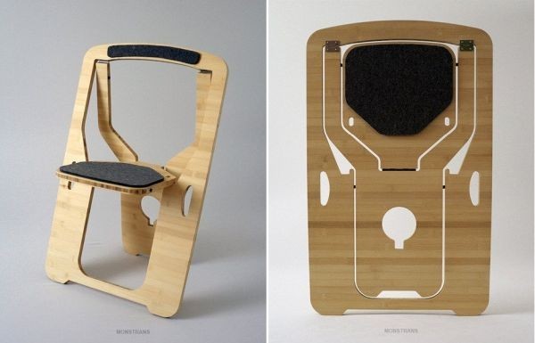 Chiếc ghế này là một trong những mẫu ghế vô cùng tiết kiệm diện tích. Nó gồm 3 phần với 5 bản lề có thể dễ dàng mở ra khi muốn sử dụng và gấp lại như một tấm ván mỏng khi đã sử dụng xong nên rất tiết kiệm diện tích và phù hợp với những không gian sống chật hẹp. Phần mặt ghế và thanh dựa có miếng lót nệm giúp người dùng thêm thoải mái khi sử dụng.