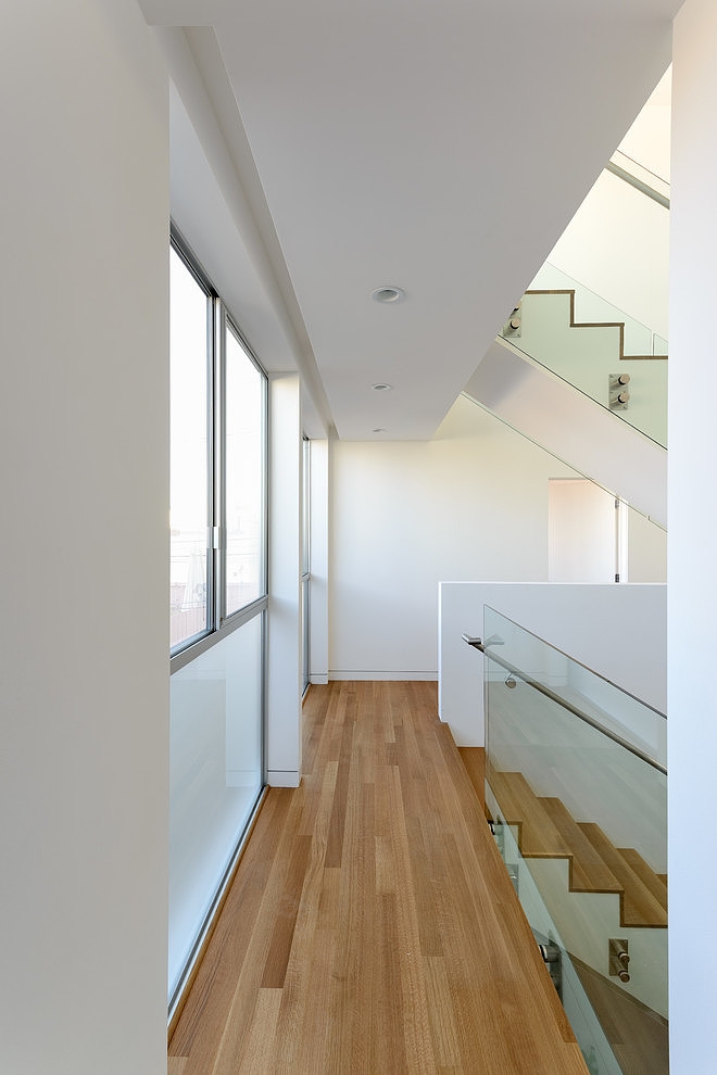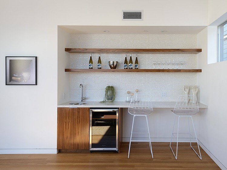 Tất cả các phòng đều được bao bọc bằng những bức tường trắng và được điểm xuyết với vật liệu gỗ, tạo cảm giác của sự chào đón nồng nhiệt. Ngôi nhà cũng được trang trí với hiệu quả thẩm mỹ tinh tế, phá vỡ sự đơn điệu của phong cách tối giản hiện đại. Bên trong nhà, các ngóc ngách đều được soi rọi ánh sáng từ những cửa sổ lớn. Ngoài ra, phòng khách và phòng ăn cũng có thể mở ra ngoài nhờ các cửa kính trượt.