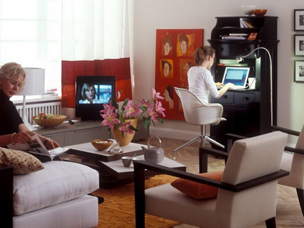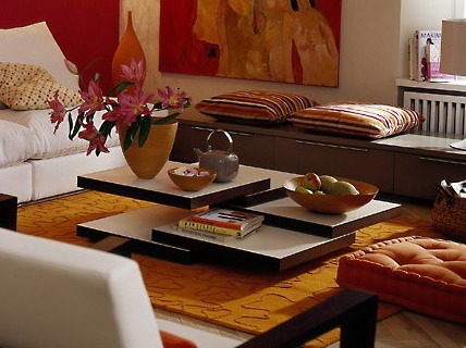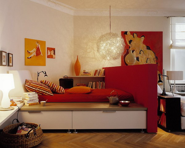 Thảm màu đất son và chiếc bình gốm màu nhạt có cùng giai điệu. Vách ngăn màu anh đào tối (cao khoảng 1.30 cm) ngăn cách khu vực phòng khách và phòng ngủ. Bộ ấm chén phong cách Nhật Bản là hoàn toàn phù hợp với chiếc bàn thấp. Sự hòa quyện giữa hai tông màu đỏ – trắng đã khoác lên phòng khách một vẻ ngoài hiện đại, trẻ trung tươi mới và đầy cảm hứng.