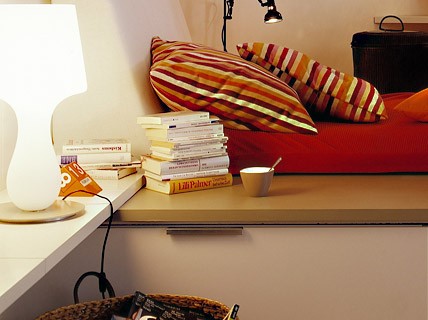 Bên trái đầu giường (hướng tới phòng khách) là một loạt kệ sách và tivi nhỏ. Bên phải là một kệ dài, hẹp phục vụ như một góc có thể thay đồ. Thậm chí có thể kết hợp thêm một vài vật dụng lưu trữ nhỏ để cung cấp thêm khả năng lưu trữ.