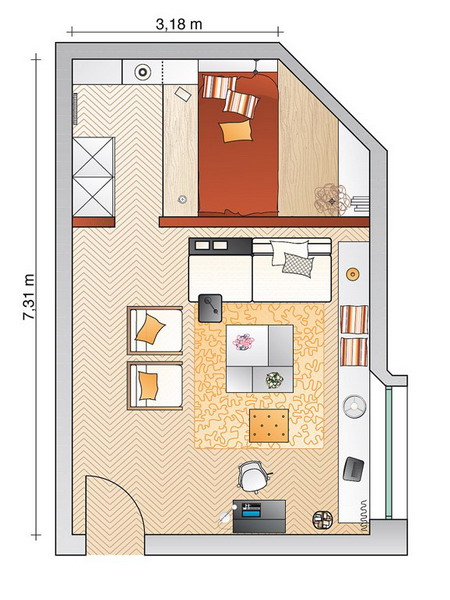 Sơ đồ chi tiết căn phòng 23m2 được bố trí theo 4 góc cho 4 chức năng khác nhau chia thành hai khu vực sinh hoạt chung (cho phòng khách, phòng ăn) và riêng (cho phòng ngủ). Không chỉ ở cách sắp đặt mà cả cách phân vùng thông minh cũng giúp cho việc chia sẻ không gian hiệu quả. Đây thực sự là một minh họa sống động phù hợp cho những căn hộ nhỏ.