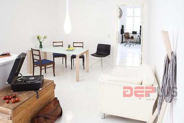 Khu vực nấu ăn và ăn uống cũng được phủ trắng, sử dụng đồ nội thất bằng gỗ nổi bật màu sắc trong căn phòng.