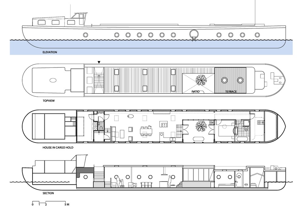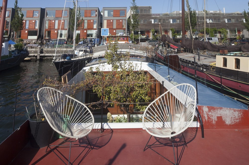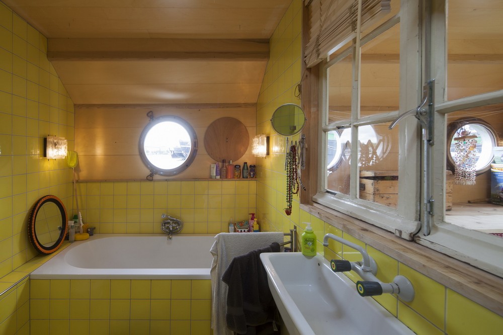 Nội thất bằng thép trong khoang của ngôi nhà thuyền được cách ly bằng 10cm xốp và được bao phủ bởi gỗ dán sáng màu. Sàn bằng xi măng đúc và bên trên là các đường ống. Tấm vách ngăn ngay lối vào đóng vai trò là vách ngăn cho bồn tắm ngoài trời và một cây lê ở cạnh đó. Sự an toàn của trẻ em trên thuyền thường được đặt lên hàng đầu và vách ngăn này cũng là một giải pháp an toàn cho trẻ tha hồ nô đùa mà không sợ bị rơi xuống biển. Cây lê không phải là thứ ta hay thấy phổ biến trên một con thuyền nhưng trọng lượng và kích thước của nó chẳng là gì so với một nhiệm vụ chuyên chở hàng trăm tấn cát, xi măng và đá mà con thuyền từng chở. Sàn ngoại thất cũng đã được phục hồi và hiện đại hóa. Con thuyền bây giờ đã trở thành một căn hộ nhỏ độc lập xinh xắn. (Ảnh: Luuk Kramer ©)