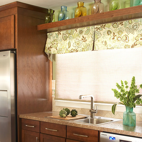 Tại đây, một chiếc diềm nhỏ xinh mang lại một diện mạo đẹp đẽ cho phòng bếp nhưng không hề ngặn chặn ánh sáng. Nếu bạn muốn có sự riêng tư, vật liệu kính mờ vừa thỏa mãn mong muốn của bạn vừa để ánh sáng lọt qua tự nhiên.