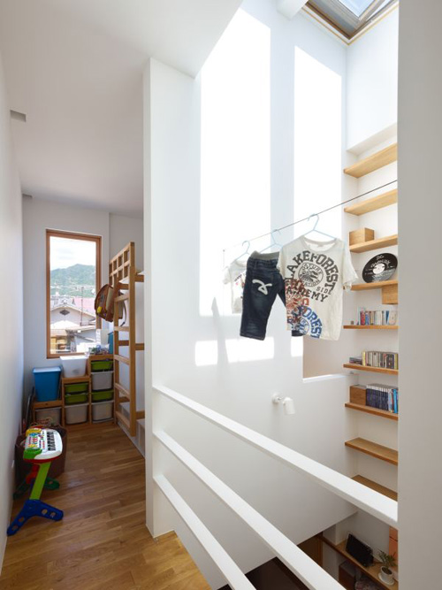 Tầng 2 gồm có một phòng ngủ và một phòng dành cho trẻ nhỏ. Dây phơi được mắc ở khu vực hành lang tận dụng ánh sáng cửa sổ trần rọi xuống.
