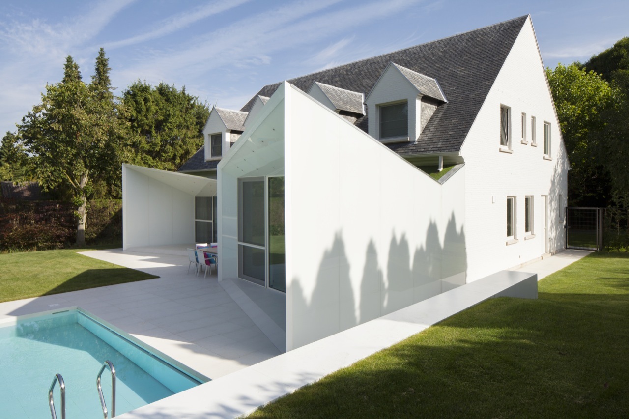 Kiến trúc sư giải thích: “Khách hàng đã đồng ý với thiết kế để có được giấy phép xây dựng đúng theo quy định xây dựng. Những quy định thật sự đã có tác động rất lớn đến thiết kế của biệt thự.” Bên ngoài của ngôi nhà được sơn toàn bộ màu trắng. Hồ bơi hiện tại đã được cải tạo đơn giản với hai khối lượng bổ sung được thêm vào nhằm tạo ra quá trình chuyển đổi liền mạch giữa nội thất và ngoại thất, kết nối ngôi nhà, hồ bơi và khoảng sân xanh tươi với nhau.