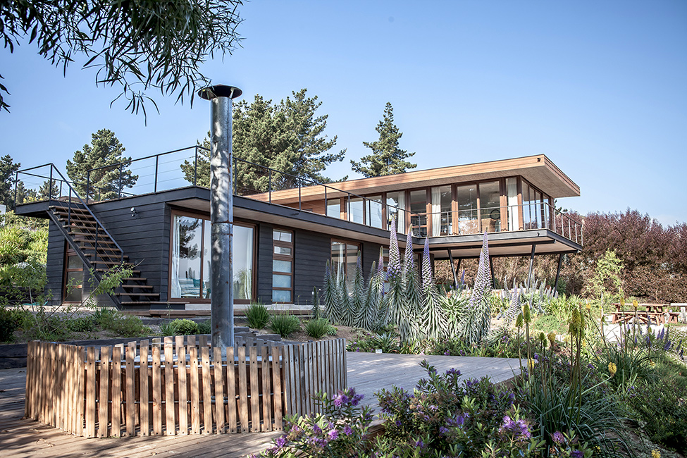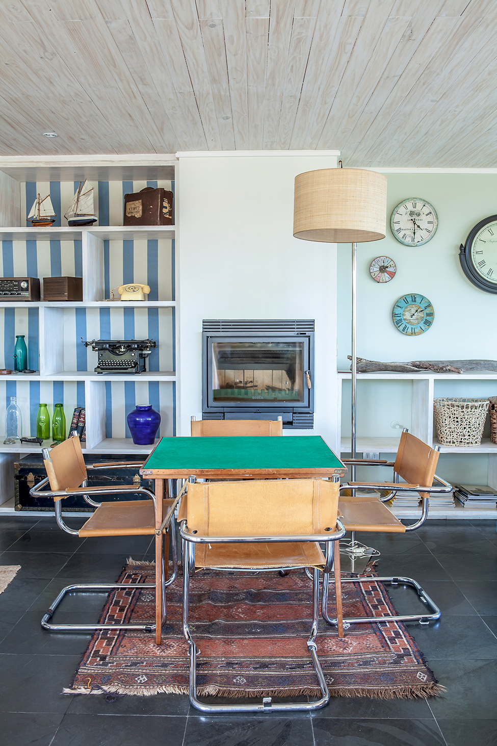 Ở tầng trên, ánh sáng mặt trời tràn ngập phòng khách rộng, nơi được trang trí bằng những đồ trang trí biển theo chủ đề và các yếu tố sang trọng khác. Một sàn ngoại thất dài được nối ra từ phòng khách pha trộn hài hòa với cảnh quan thiên nhiên, cho phép người sử dụng tha hồ sưởi ấm trong ánh mặt trời.