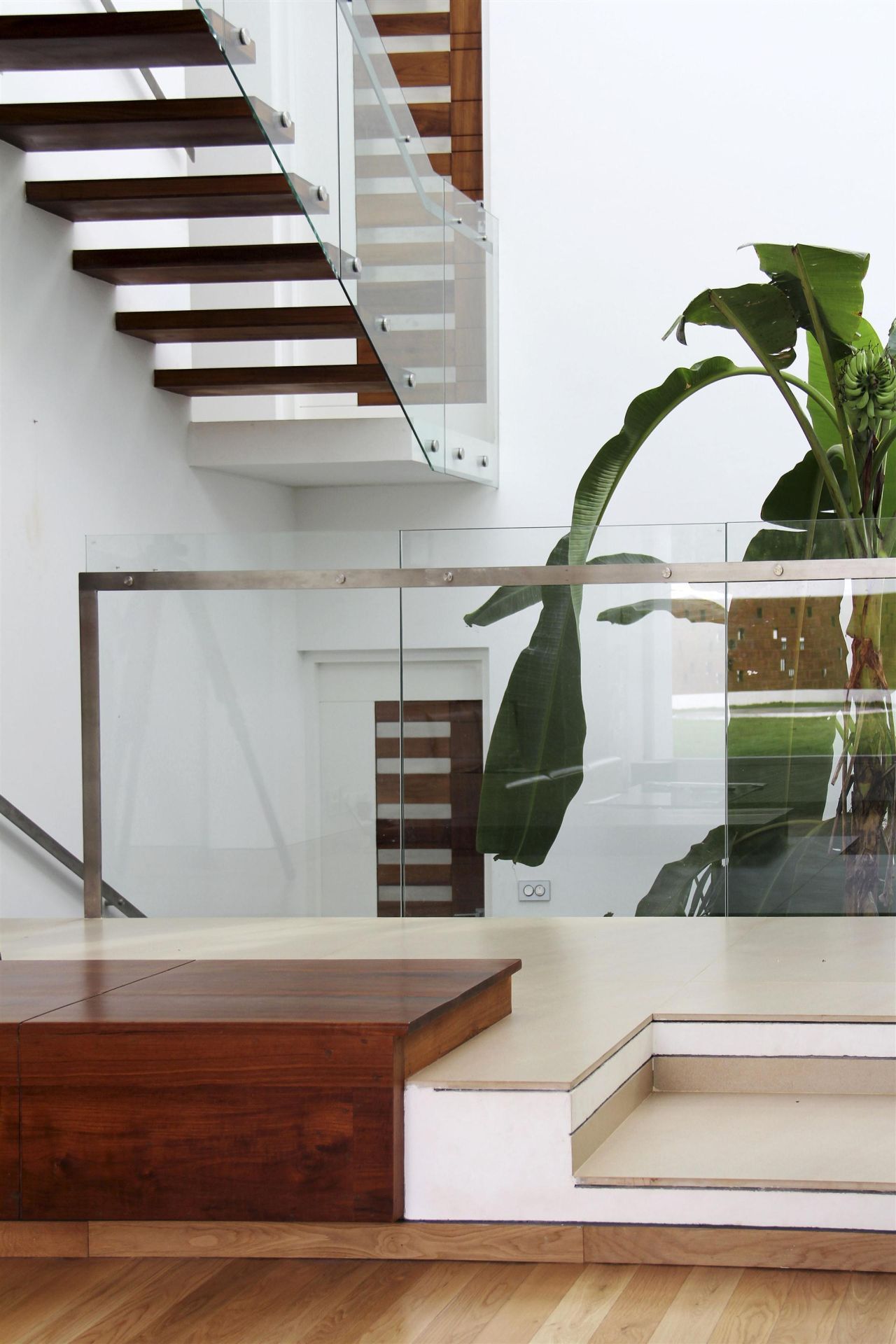 Ngôi nhà được trang trí rất ít với trần nhà hình vòm, sàn gỗ và hồ bơi bên trong dẫn lên phòng khách và phòng ăn. Trong sân vườn, gần cầu thang và tầng trên, cây dương xỉ, chuối và những cây trồng nhiệt đới khác được trồng xen kẽ với nhau, tạo cảnh quan xanh tươi cho ngôi nhà.