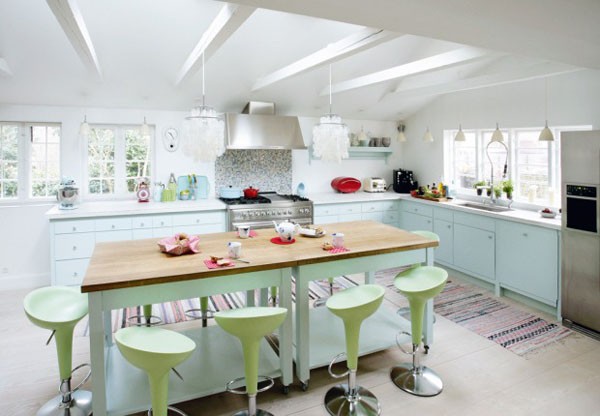 Bên cạnh những phong cách nổi loạn với màu sắc rực rỡ, những màu sắc pastel nhẹ nhàng cũng là nét tiêu biểu trong phong cách nội thất thập niên 80. Trong căn bếp này những chiếc tủ bếp sơn màu pastel đã khiến không gian nấu nướng trở nên lãng mạn pha chút cổ điển mà vẫn cực kỳ thanh lịch, tinh tế.