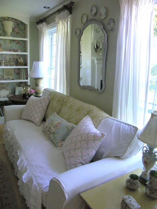 Phòng khách này nhẹ nhàng và tao nhã với những chiếc gối tựa bọc vải hoa rất ăn ý với giấy dán tường hoa.