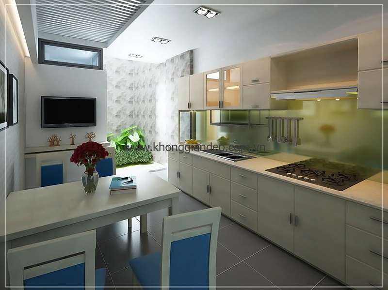 Căn bếp nhỏ nhưng được sắp xếp gọi gàng với đầy đủ nội thất: tủ bếp, bàn ăn. Chút xanh dương thanh lịch trên tông màu trắng nền nã chủ đạo của bộ bàn ăn cũng được điểm xuyết rất hợp lý.