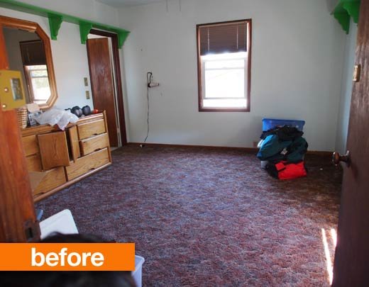 Căn phòng kho này không rộng nhưng khá vuông vức và thoáng đãng nhờ sở hữu 2 cửa sổ. Thế nhưng nội thất trong phòng đã khá cũ; sàn nhà bằng tấm thảm lông màu nâu tím kết hợp cùng tường màu xanh nhạt khiến căn phòng tẻ nhạt và thiếu sức sống. Trước khi dành căn phòng này cho cậu con trai 5 tuổi – bé Adrian, bố của bé đã quyết định cải tạo lại căn phòng và trang trí phòng theo phong cách thủy thủ mà cậu bé mê tít.