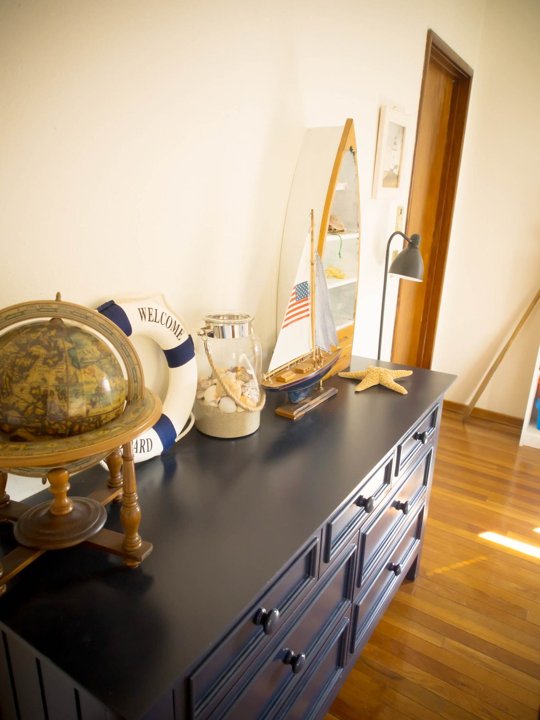 Ngay từ cửa ra vào, tấm bảng treo và những vật dụng trang trí hình mỏ neo đã báo hiệu bên trong căn phòng là không gian của biển.