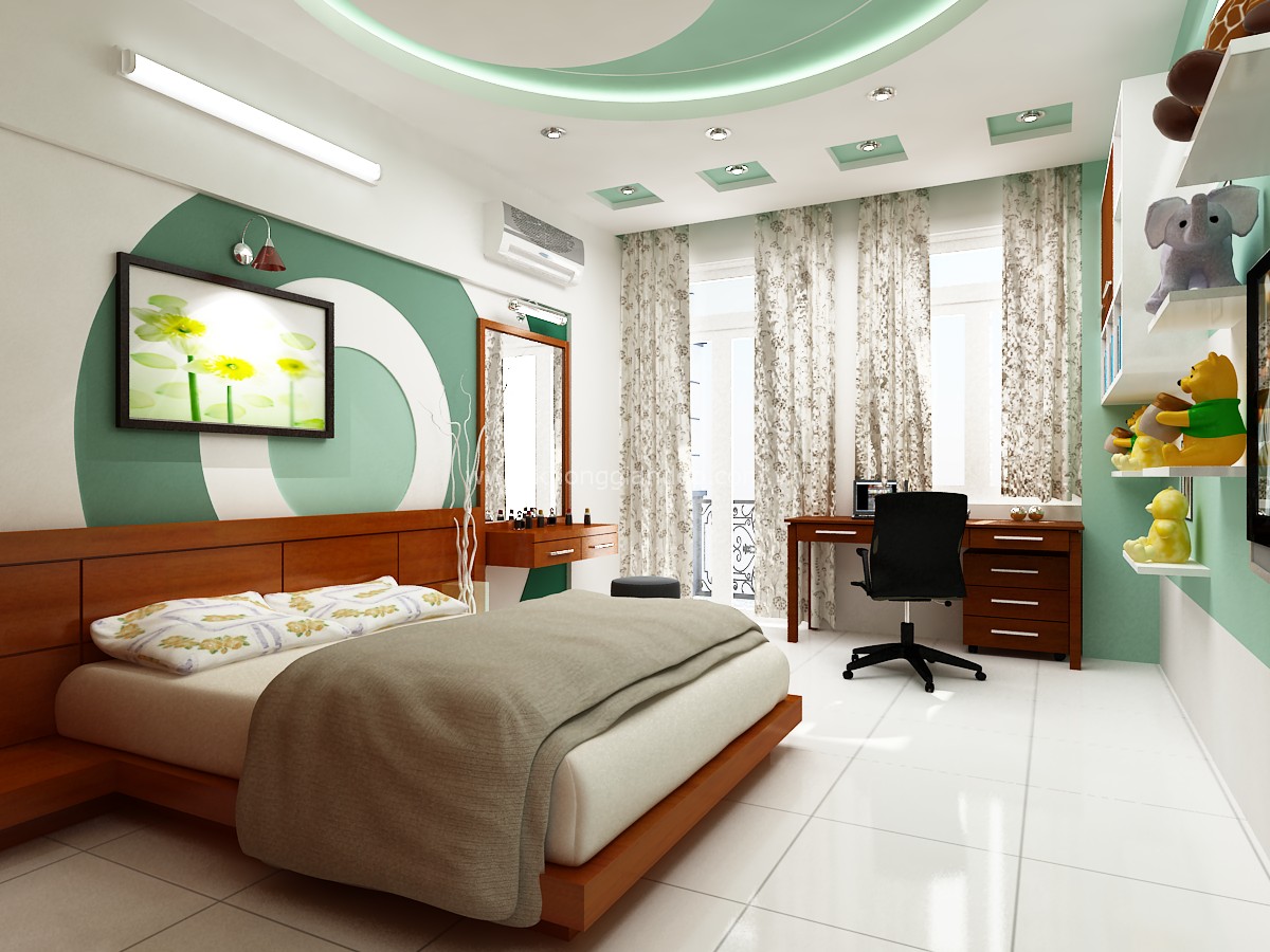 Cửa mở ở hướng Bắc nên trang trí rèm màu xanh, vì hướng này hành sinh vượng là Thủy