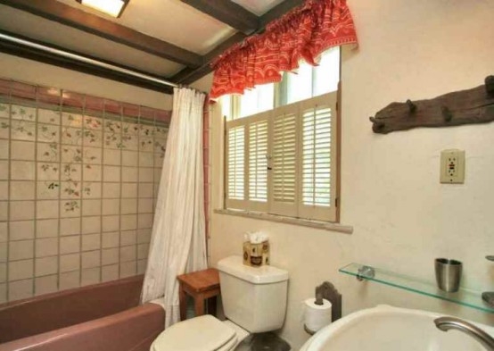 Phòng tắm rộng rãi thư giãn với rèm cửa màu đỏ cam