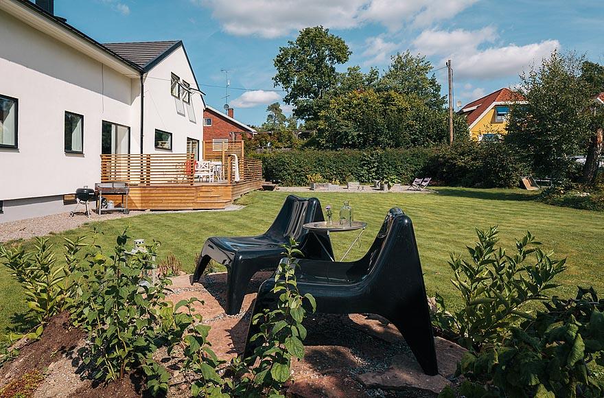Ngôi nhà cũng có một khu vườn rộng rãi và đẹp mắt, cùng một hàng hiên bằng gỗ đầy mê hoặc, là nơi lý tưởng cho cả gia đình thư giãn. Bên cạnh đó, các cửa sổ lớn mở ra ngoài làm tăng cảm giác như đang sống giữa thiên nhiên.