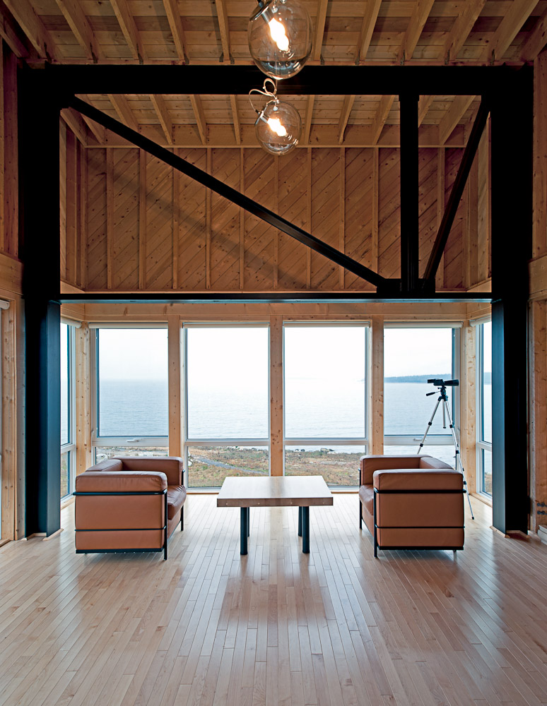 Việc xây dựng ngôi nhà không đòi hỏi sự đầu tư đáng kể. Kiến trúc sư giải thích rằng ngôi nhà được xây dựng với ngân sách cực kỳ thấp nhưng vẫn đáp ứng được khí hậu khắc nghiệt tại vùng đất: “Đây là một hình mẫu ngôi nhà được xây dựng với giá cả khiêm tốn và phải chăng. Một cấu trúc thượng tầng lớn bằng thép được mạ kẽm và neo vào vách đá. Cấu trúc chính bằng thép thể hiện trên nội thất. Ngôi nhà được dựng theo hình thức căn hộ đóng khung hình hộp đơn giản và được bao quanh là gỗ tuyết tùng“. Tầng một của ngôi nhà là một phòng khách mở và rộng rãi với cửa sổ trên ba mặt và tầng hai là một phòng ngủ với tầm nhìn toàn cảnh ra đại dương. Sự đơn giản trong kiến trúc ngôi nhà giúp tăng cảm giác yên bình, phù hợp với chốn nghỉ ngơi, xa lánh cuộc sống ồn ào.