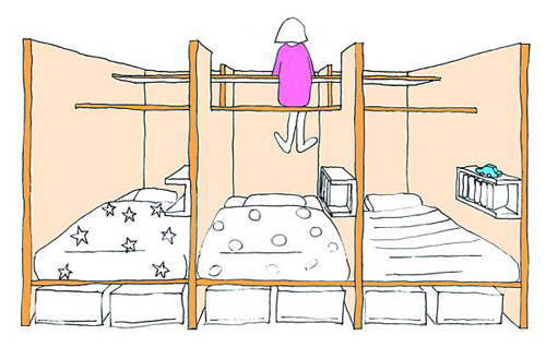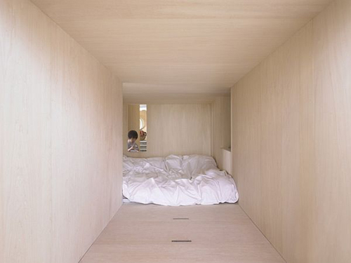 Chiếc hộp với lớp vỏ bọc màu xanh được sử dụng làm phòng ngủ của hai vợ chồng và đứa con nhỏ nhất. Chiếc hộp còn lại là một không gian riêng tư dành cho ba đứa con lớn hơn.