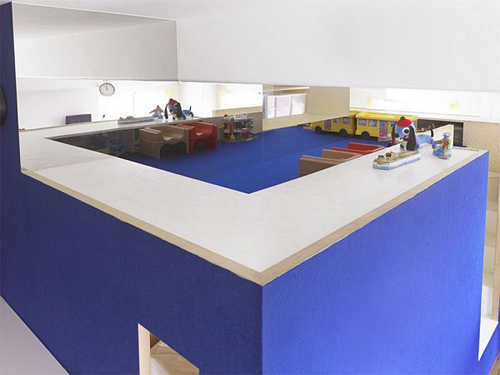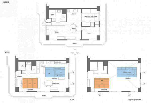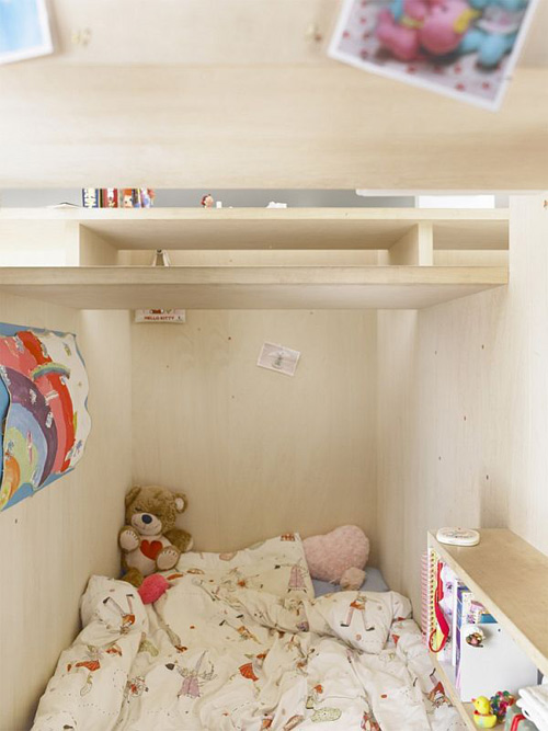Ban đầu, căn hộ với diện tích khoảng 70m2 này được chia thành nhiều phòng khác nhau. Tuy nhiên, các kiến trúc sư nhận định việc giữ lại cấu trúc ban đầu sẽ rất khó tạo ra được một thiết kế nội thất tươi sáng và rộng rãi. Kết quả, tất cả các bức tường đã được xóa bỏ, biến toàn bộ căn hộ thành một căn phòng rộng lớn. Sau đó, hai cấu trúc hình hộp bằng gỗ đã được thêm vào, bố trí nằm trên một đường chéo. Không gian phía trên hai chiếc hộp chỉ cao 1.1 mét nhưng đủ chỗ để cho những đứa trẻ chơi đùa.