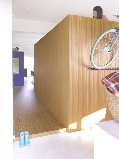 Hành lang bố trí hệ tủ gồm nhiều hộp nhỏ chứa đồ cho trẻ nhỏ. Xe đạp và các đồ dùng khác được treo lên nhằm giải phóng không gian sàn, giữ cho mọi thứ được gọn gàng.