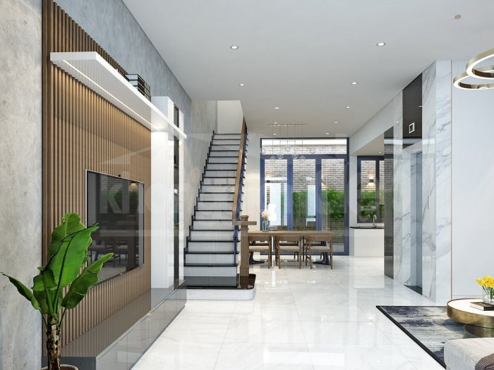 Nội thất căn nhà đều được thiết kế theo phong cách hiện đại, tối giản, nhằm tối đa hoá không gian sử dụng. Phòng khách nối tiếp phòng bếp/ăn tạo thành 1 không gian mở rộng lớn ở khu vực tầng trệt. Việc sử dụng gạch lót sàn màu trắng và đá hoa cương ốp tường còn khiến không gian nơi đây bừng sáng, mang lại cảm giác thoải mái dễ chịu.
