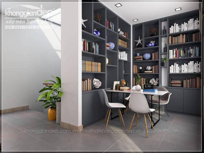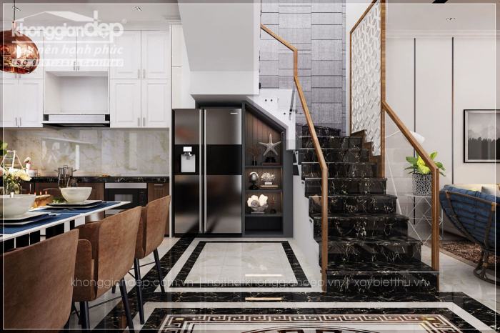 ✍Những đường nét mạnh mẽ và hình khối được sử dụng cho tầng trệt mang đến sự hiện đại, cùng với màu sắc trung tính, không gian tầng trệt trở nên ấm cúng và gần gũi. Cùng với đó, một vài nét cổ điển, những chi tiết điêu khắc mái vòm trên nội thất được thêm vào một cái tinh tế và hài hoà tạo nên nét độc đáo riêng cho căn nhà phố này.
