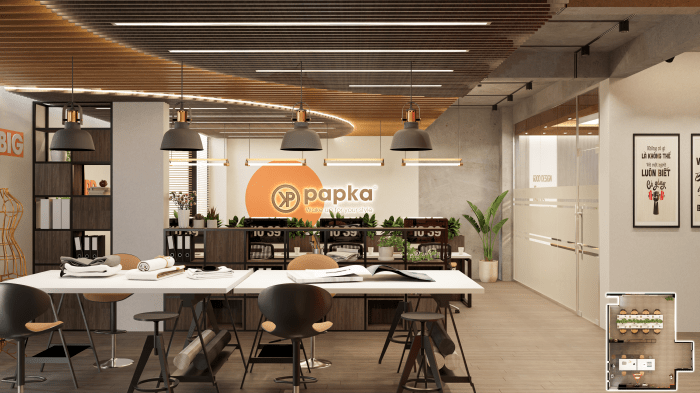 Không Gian Showroom và khu vực Văn Phòng công ty được thiết kế nhấn mạnh các yếu tố Thương Hiệu Kinh Doanh